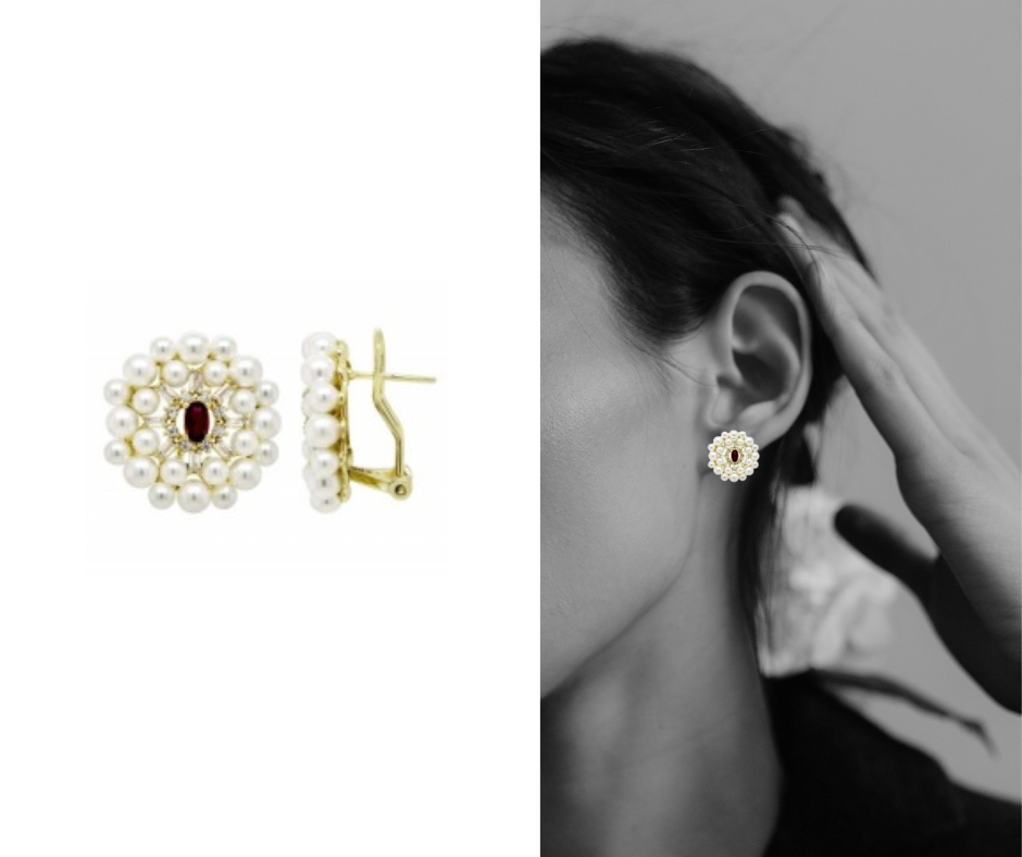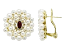 Elevate your style with these exquisite gold-plated sterling silver earrings. Featuring a stunning oval center stone adorned with white CZ and ruby accents, these earrings exude sophistication and elegance. The delicate shell pearls add a touch of natural beauty, making them the perfect accessory for any occasion. Crafted from high-quality materials, these earrings are both stylish and durable.